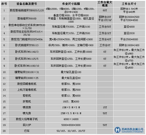 蘇州浩凱具有較強的機械加工和鉚焊制作能力,機械加工擁有數控落地銑鏜床、落地鏜床、數控單柱移動立式車床、數控雙柱主柱車床、數控龍門銑鏜床、臥式銑鏜床、臥式車床數臺、橫臂鉆床等大型機加工設備。同時還具有鉚焊制作設備數控四輥卷板機、上輪萬能卷板機、剪板機、折彎機、噴漆房、噴丸房、數控火焰等離子機、回火爐等設備。 設備加工范圍如下表: