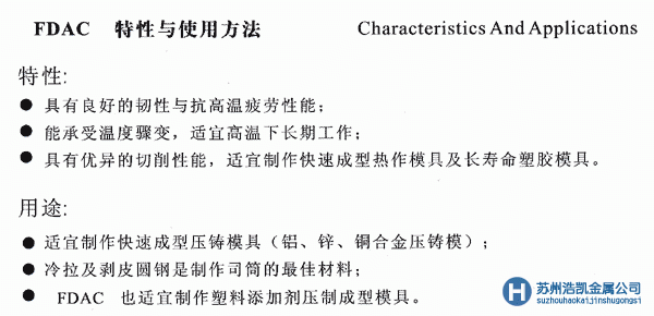 熱作模具鋼材性能用途、密度硬度和化學成分: FDAC易切削預硬熱作模具鋼 名奇 牌 號 對 照 MQ GB 國標 JIS 日本 ( 日 立 大 同 ) ASSB 瑞典 AISI 美國 DIN 德國 BOHLER 奧地利 MQH13H FDAC H13 易切削 化 學 元 素( % ) Chemical Composition(%) C 碳 Si 硅 Mn 錳 Cr Mo 鉬 V 釩 Ni 鎳 W 鎢 S 硫 P 磷 0.380 1.000 0.500 5.000 1.200 1.000 0.005 SKD4一般熱作模具鋼 名奇 牌 號 對 照 MQ